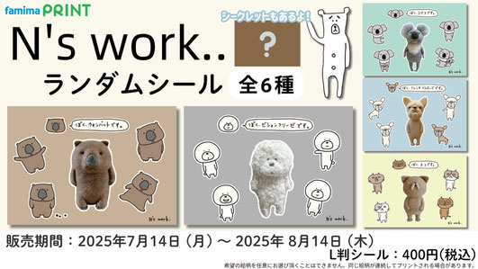 なんと!! 来週7月14日(月) 10:00から8月14日(木)まで、全国のファミリーマートのマルチコピー機 「ファミマプリント」にて、N's work..のシールがプリントできるようになります!!! 全6種がランダムでプリントされます。 シール用紙なので、切り取って使用してもそのまま飾ってもOK! シークレットの絵柄もあります!! もう、私がめちゃくちゃ楽しみで!...